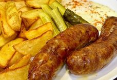 Колбаски гриль с картофельными дольками и яйцом